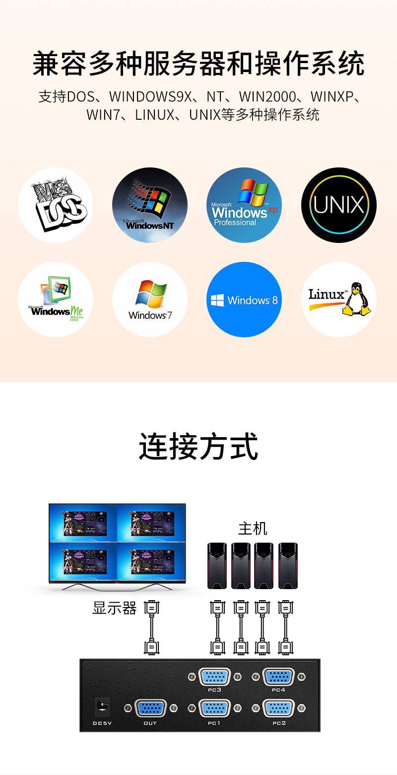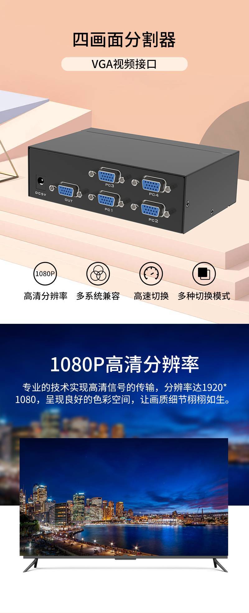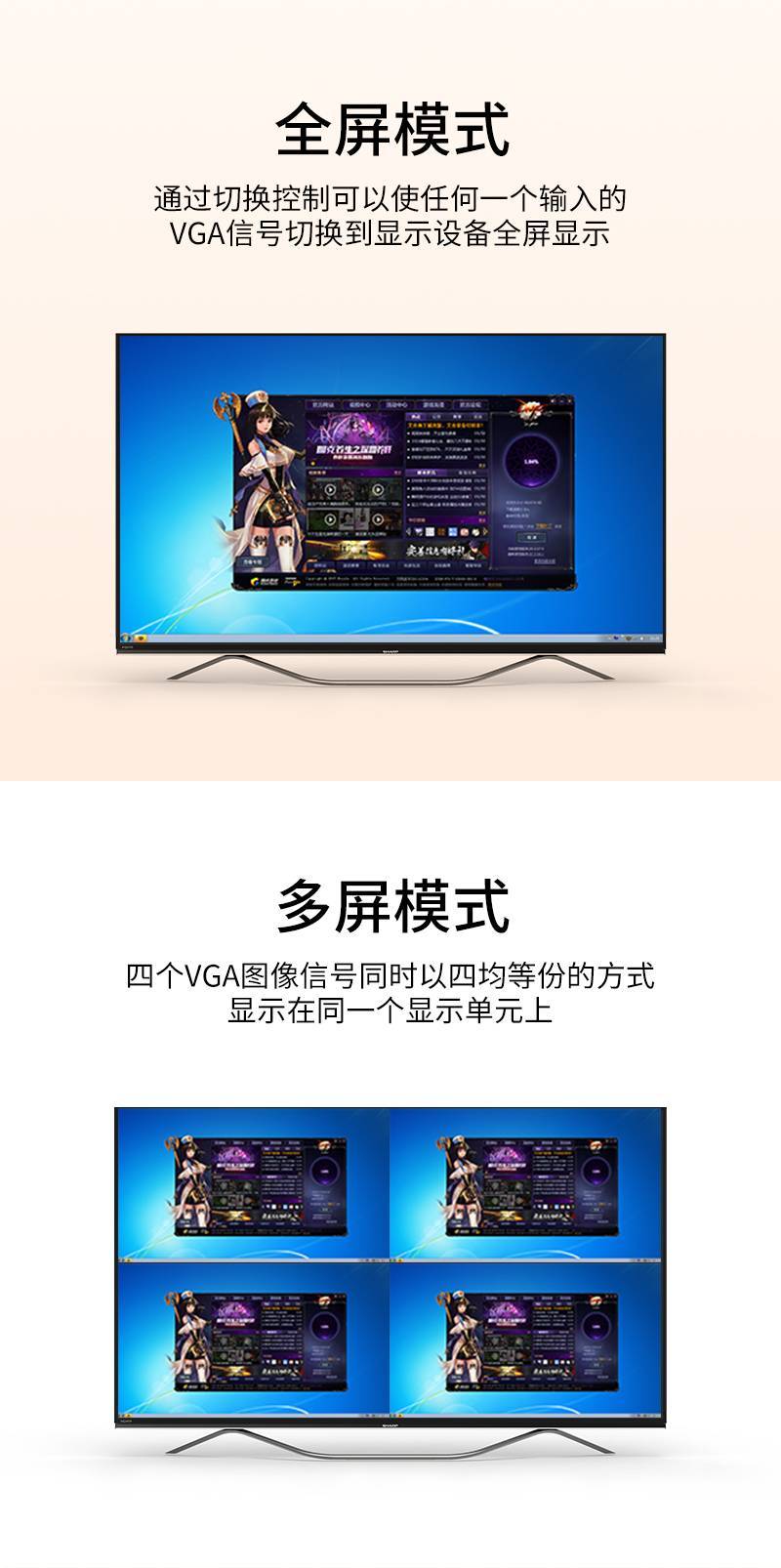 ·4路vga输入,1路vga输出,4画面同时显示,多种分割模式可选.