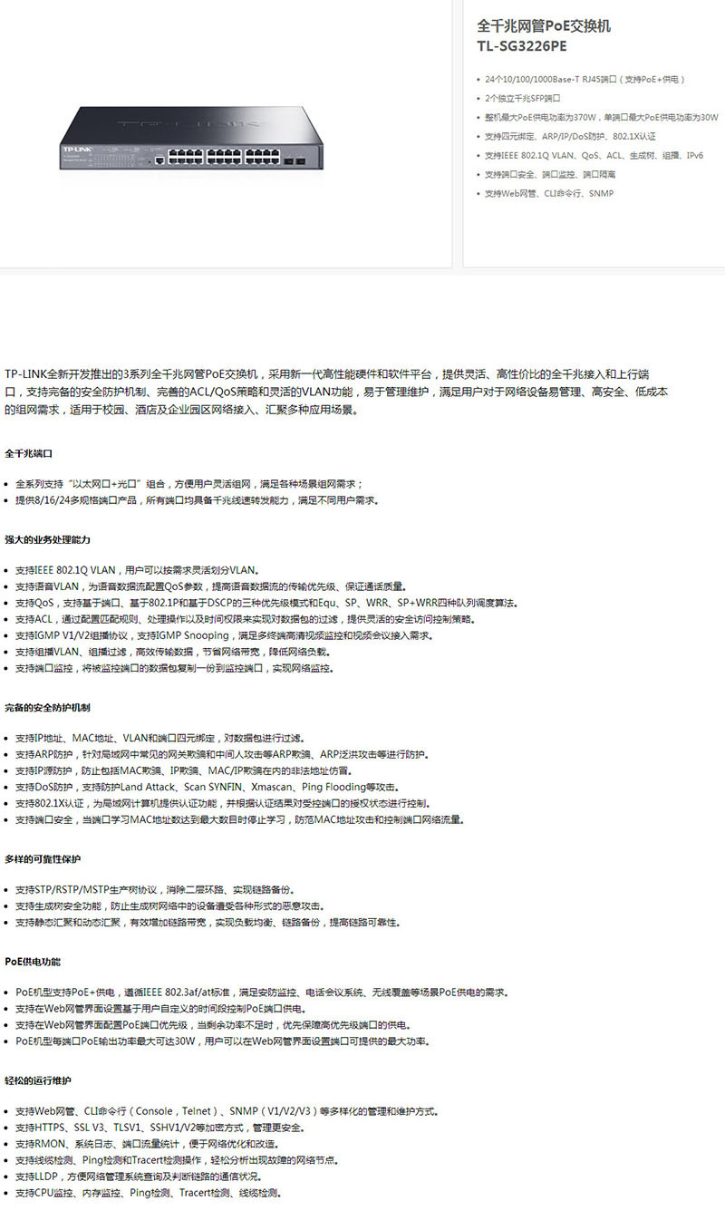 ·24个10/100/1000Base-T RJ45端口(支持PoE+供电) 2个独立千兆SFP端口 整机PoE供电功率高达370W,单端口PoE供电功率高达30W 支持四元绑定、ARP/IP/DoS防护、802.1X认证 支持IEEE 802.1Q VLAN、QoS、ACL、生成树、组播、IPv6 支持端口安全、端口监控、端口隔离 支持Web网管、CLI命令行、SNMP